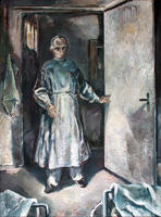 | Arzt im Krankenzimmer, Prof. Dietzel, HNO Rostock 135 x 100 cm Öl auf Leinwand bez. u. m.: R. Paris 77 Kunsthalle Rostock Werkfoto: Wolfgang Lücke |