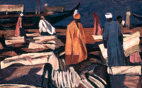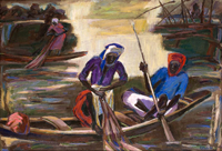 Bastmattenhafen in Kerala 35 x 57 cm Öl auf Holz nicht bezeichnet im Besitz des Künstlers |