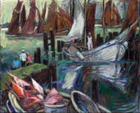 | Auftakeln in Bodstedt (Vor dem Zeesbootrennen) 80 x 110 cm Öl auf Leinwand im Besitz des Künstlers Werkfoto: Wolfgang Lücke |